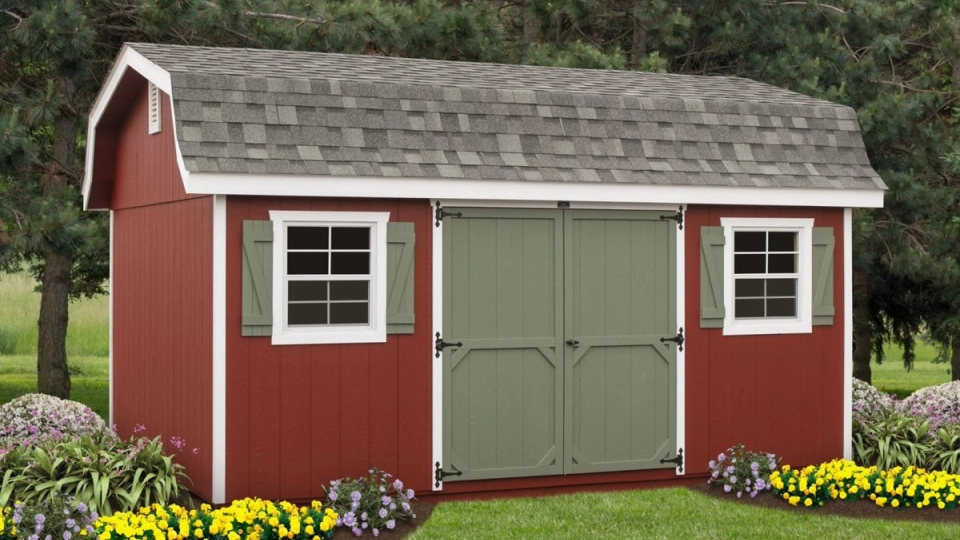 The Garden Hwyall shed has a barn-like roof with a decorative bottom edge, ideal for adding a loft and features upgraded trim, shutters, and larger windows.